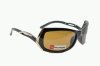 Okulary przeciwsłoneczne z brązową, polaryzacyjną soczewką, idealne do jazdy samochodem, ozdobny zausznik, opływowy kształt.